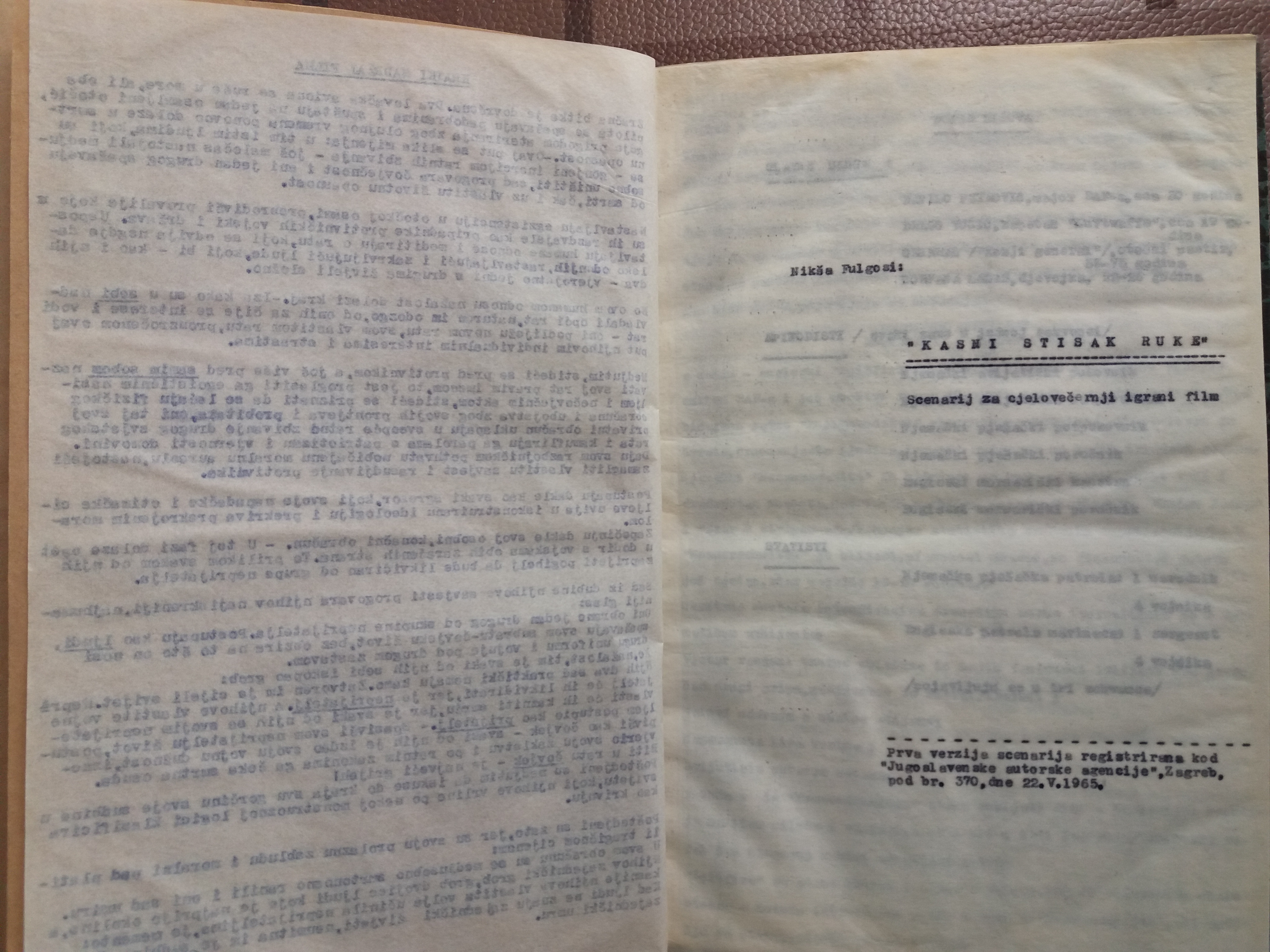 Fulgosi, Nikša. Scenarij za film Kasni stisak ruke, 1965....