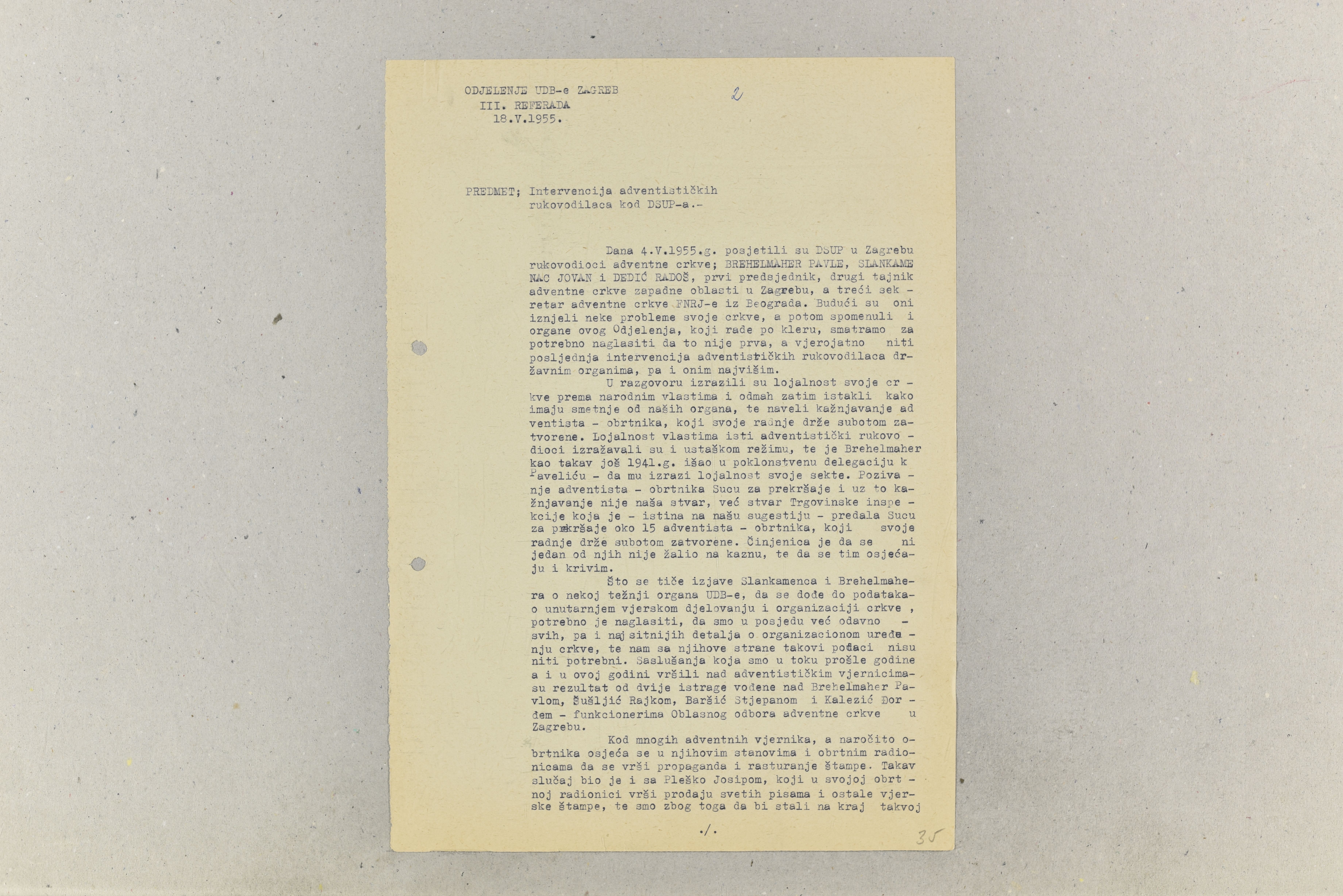 One of the religious communities whose activities were monitored by State Security Service was the Seventh-day Adventist Church, a Protestant denomination which has existed in the territory of Croatia since the beginning of the 20th century. Besides the problems common to all religious communities, problems in relations between the Seventh-day Adventist Church and the communist regime also arose, for instance, in education, employment and in the army due to absence from school and work on Saturdays on religious grounds. This is illustrated by an internal note by the State Security Administration/Zagreb Department dated May 1955, concerning a complaint from leaders of the Seventh-day Adventist Church to State Internal Affairs Secretariat of the People's Republic of Croatia.