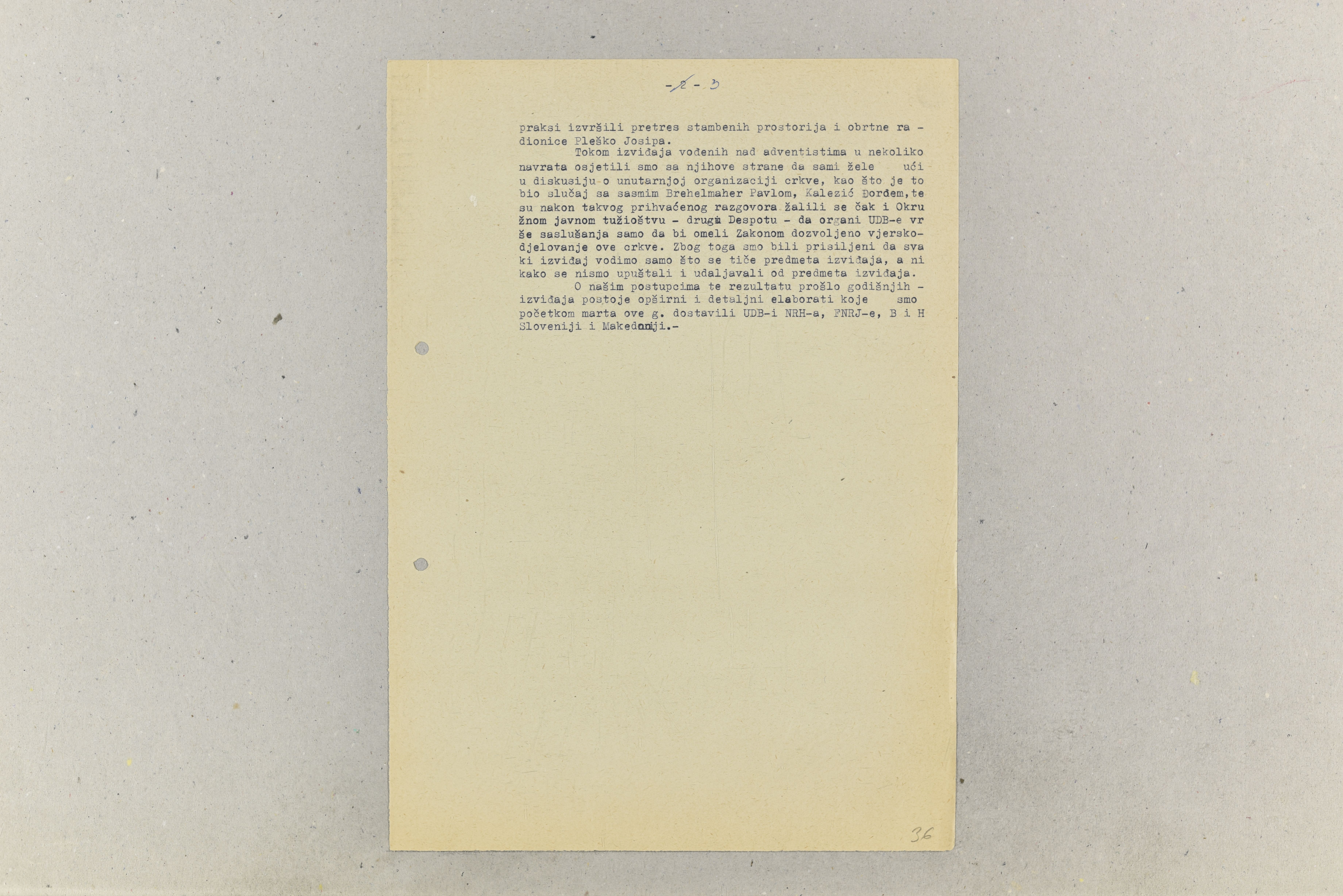 The reason for the complaint was the initiation of infringement proceedings against 15 Adventist craftsmen, due to the closure of their workshops on Saturdays, filed by the State Security Administration/Zagreb Department. The note moreover reveals information on other State Security Administration activities related to members of the Seventh-day Adventist Church. It mentions the questioning of church members as a part of two investigations against leaders of the District Committee of the Seventh-day Adventist Church in Zagreb. Doubts were also expressed that many church members, in particular craftsmen, were “promoting and distributing” religious publications in their homes and workshops. To halt such practices, the State Security Administration conducted searches of their homes and workshops. Reports on the results of its investigations were sent by the Zagreb Department to the federal and republic State Security Administration, and to the equivalent services in Bosnia and Herzegovina, Slovenia and Macedonia. The extent to which the State Security Administration monitored the activities of religious communities is also illustrated by the following: in reply to a complaint from leaders of the Seventh-day Adventist Church to the State Internal Affairs Secretariat of the People's Republic of Croatia concerning the State Security Administration's intention to obtain data about the Church’s internal activities and organisation, the Zagreb Department stated that it “has long been in possession of all, including the minutest details, on the Church’s organisation.”