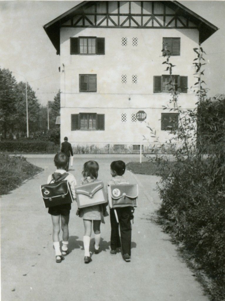 Elevi mergând spre şcoală în România anilor 1970. Fotografie