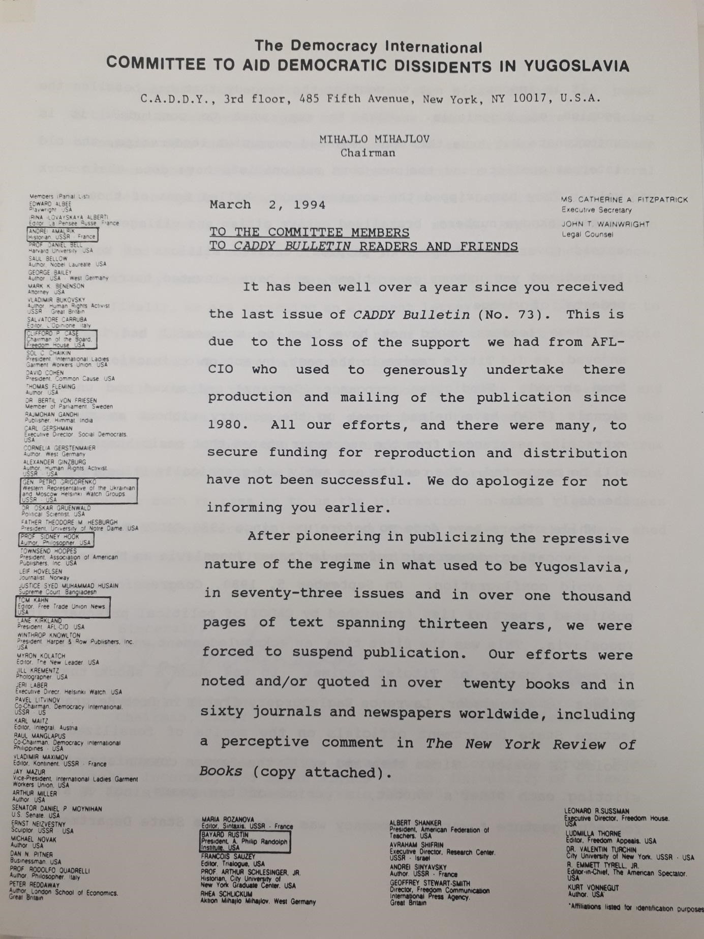 The last issue of the CADDY bulletin contained a recapitulation of the work of both the CADDY and the bulletin itself. Although the last issue appeared in November 1992, sometime later, at the beginning of March 1994, it was announced that the work of the CADDY had ended, which included the publication of the bulletin. This all happened against the backdrop of the definitive disintegration of the Yugoslav state and the war in its former territory. Such a turn of events signalled a defeat for the ideals championed by Mihajlo Mihajlov and Rusko Matulić as the main leaders of the project, who believed in the possibility of maintaining Yugoslavia in a democratized form.